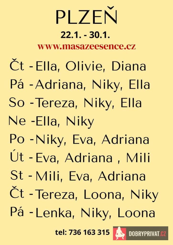 Jsem tu pro tebe od čtvrtka do neděle 22.-25.1. Vítám vás v salonu MASÁŽE ESENCE: www.masazeesence.cz Jsem SMYSLNÁ dívka Ela co vás ráda potěší. Pro vice informaci volej: 736 163 315. JEDNÁ SE O TANTRICKOU MASÁŽ S RUČNÍM VYVRCHOLENÍM. 😍 Je to velice hravá a intimní masáž do které zapojím nejen své ruce, ale i stehna, zadeček i prsa. Extra masáže: BDSM soft, kašmírová intimní masáž, koupací rituál a další. MASÍRUJI CELÁ NAHÁ. Postarám se o to, abys změnil každodenní stereotyp a načerpal jsi novou sílu. DOPORUČUJI: délku masáže 90min. a z důvodu hlubšího prožitku 120 min.