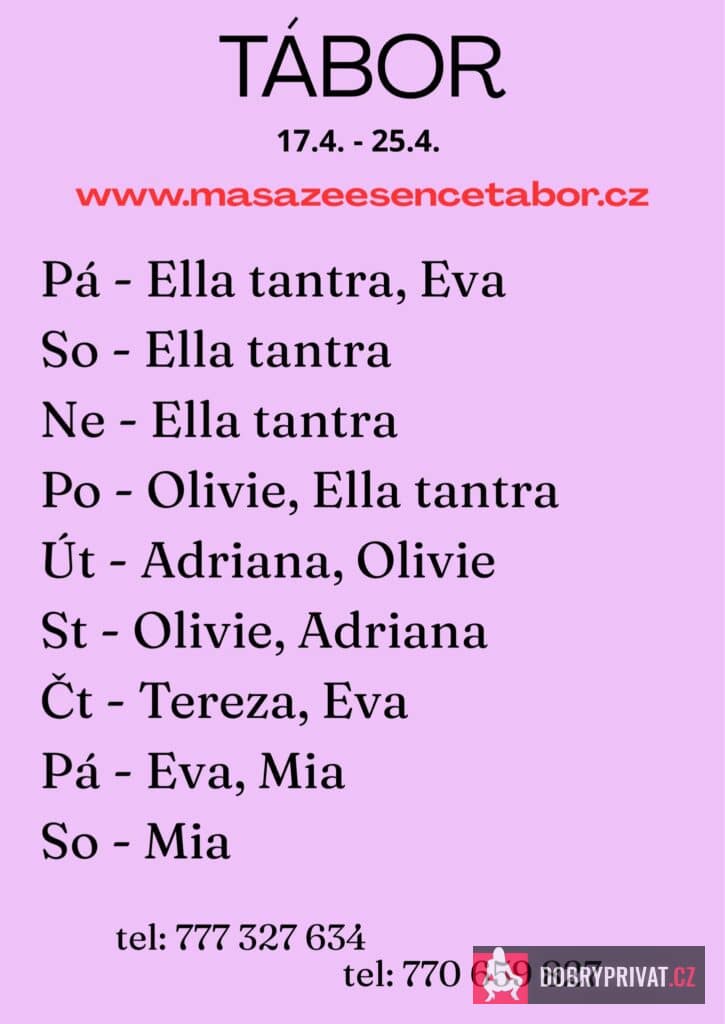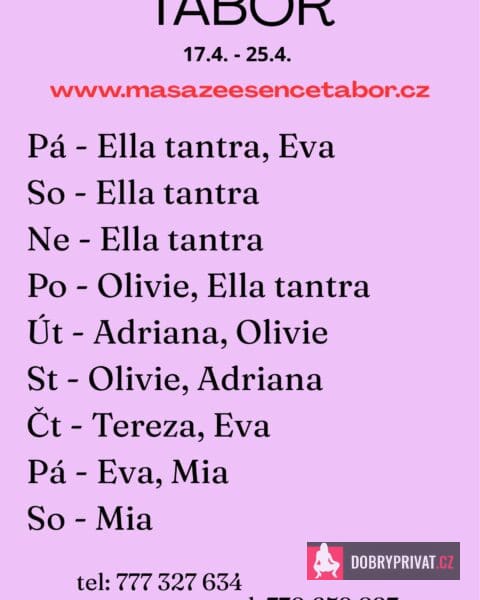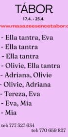 Nová dívka 🩷Jsem smyslná TANTRICKÁ bohyně. Vítám vás v salonu MASÁŽE ESENCE. www.masazeesencetabor.cz. JSEM TU PRO TEBE 19.-20.4. Jsem smyslná dívka co vás ráda potěší. TĚLO NA TĚLO. Extra: mapovani jony, masaze i pro zeny, koupací rituál, masáž prostaty a další. Pro více informací volejte: . JEDNÁ SE O TANTRICKOU MASÁŽ. Je to velice hravá a intimní masáž, do které zapojím nejen své ruce, ale i stehna, zadeček i prsa. DOPORUČUJI: délku masáže 90 min. a z důvodu hlubšího prožitku délku 120 nebo 150 min. www.masazeesencetabor.cz