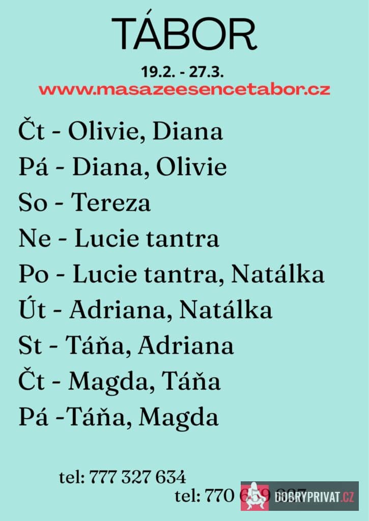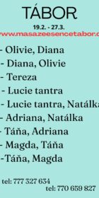 Vítám vás v salonu MASÁŽE ESENCE, www.masazeesencetabor.cz. Jsem tu pro tebe v úterý a ve středu 24.-25.3. Jsem SMYSLNÁ dívka , co vás ráda potěší. Pro více informací volejte: 777327634. JEDNÁ SE O EROTICKOU MASÁŽ S RUČNÍM VYVRCHOLENÍM. Je to velice hravá a intimní masáž do které zapojím nejen své ruce, ale i stehna, zadeček i prsa. MASÍRUJI CELÁ NAHÁ. Extra: footjob, tajemná prostata a další. DOPORUČUJI: délku masáže 60 minut a z důvodu hlubšího prožitku 90 minut. www.masazeesencetabor.cz
