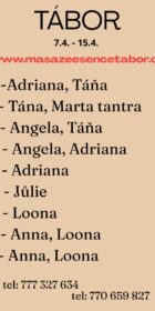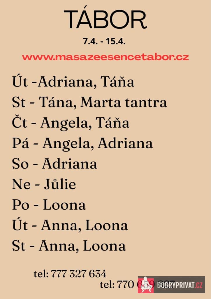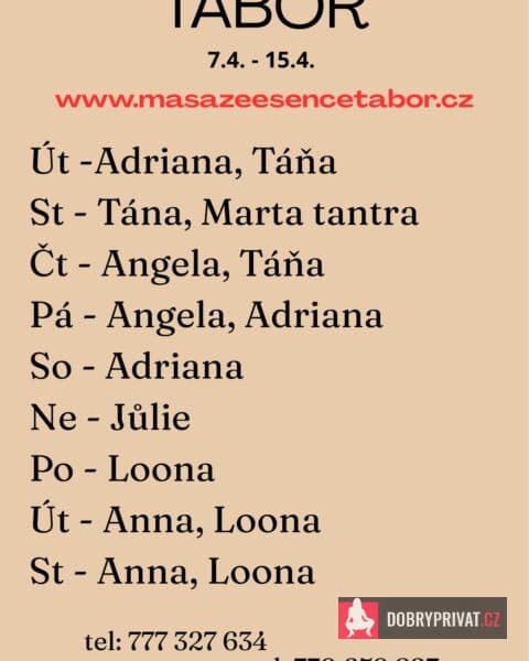 Vítám vás v salonu MASÁŽE ESENCE, www.masazeesencetabor.cz. Jsem tu pro tebe od stredy do čvrtka 15.-16.4. Jsem SMYSLNÁ dívka , co vás ráda potěší. Pro více informací volejte:770659827 nebo 777327634. JEDNÁ SE O EROTICKOU MASÁŽ S RUČNÍM VYVRCHOLENÍM. Je to velice hravá a intimní masáž do které zapojím nejen své ruce, ale i stehna, zadeček i prsa. MASÍRUJI CELÁ NAHÁ. Extra: footjob, pohledová pozice 69 a další. DOPORUČUJI: délku masáže 60 minut a z důvodu hlubšího prožitku 90 minut. www.masazeesencetabor.cz