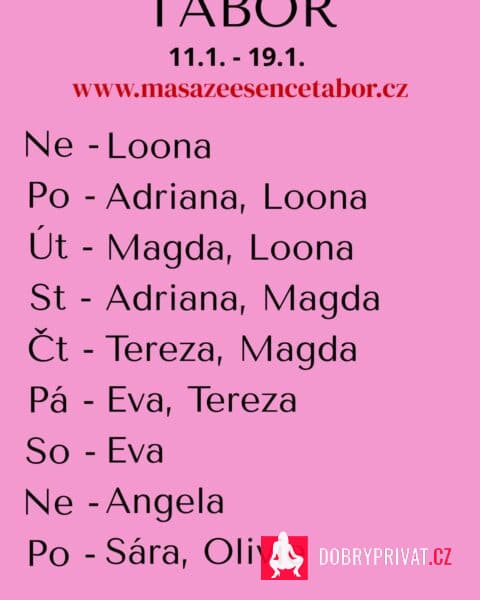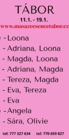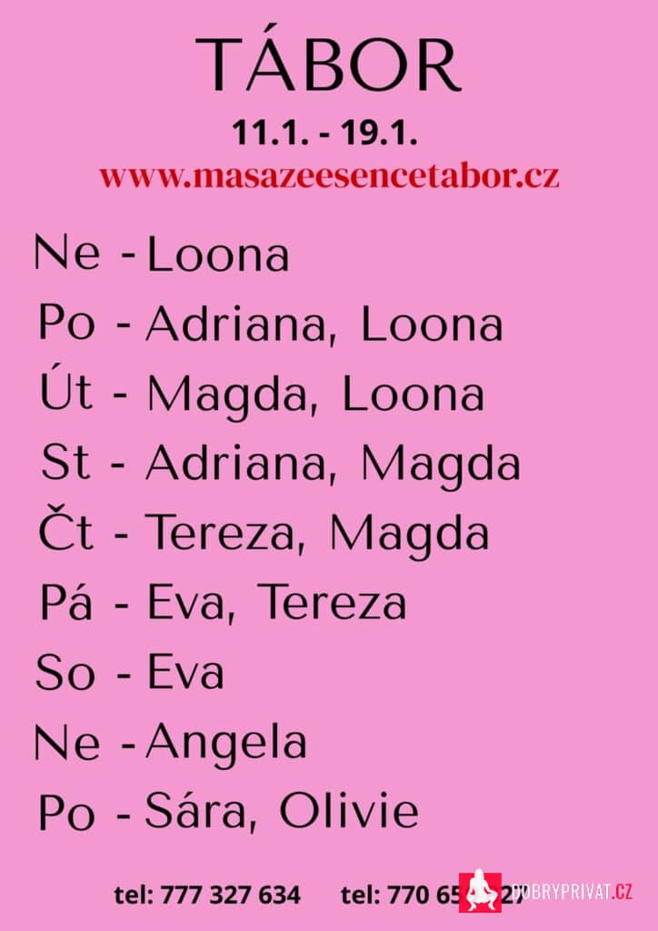 Vítám vás v salonu MASÁŽE ESENCE, www.masazeesencetabor.cz. Jsem tu pro tebe JEN V PÁTEK A SOBOTU 16.-17.1. Jsem SMYSLNÁ dívka EVA co vás ráda potěší. Pro více informací volejte: 777 327 634 nebo 770 659 827. JEDNÁ SE O EROTICKOU MASÁŽ S RUČNÍM VYVRCHOLENÍM. Je to velice hravá a intimní masáž do které zapojím nejen své ruce, ale i stehna, zadeček i prsa. MASÍRUJI CELÁ NAHÁ. Extra: lávové kameny, masáž lingamu, tajemná prostata a další. DOPORUČUJI: délku masáže 60 minut a z důvodu hlubšího prožitku 90 minut. www.masazeesencetabor.cz
