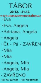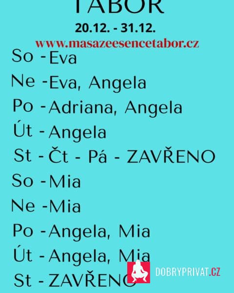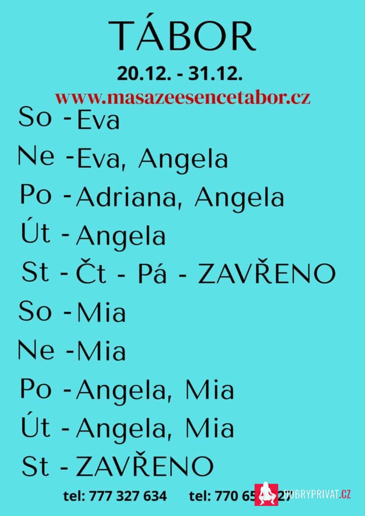 SLEVA! VOLEJ!!! Vítám vás v salonu MASÁŽE ESENCE, www.masazeesencetabor.cz. Jsem tu pro TEBE od soboty do úterý 27.-30.12. Pro více informací volejte: 777327634 nebo 770659827. Jsem MIA a jedná se o EROTICKOU MASÁŽ. Tím to vás zvu do světa uvolnění a jemné smyslnosti. BDSM Vzájemná úcta je v mé práci důležitá k navázání společného intimního vztahu.❤️ DOPORUČUJI: délku masáže 60 min. nebo pro zajímavější zážitek 90 min. JEDNÁ SE O EROTICKOU MASÁŽ S RUČNÍM ZAKONČENÍM.