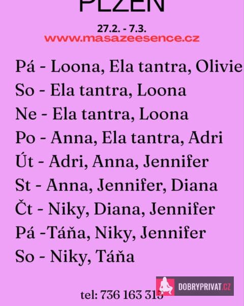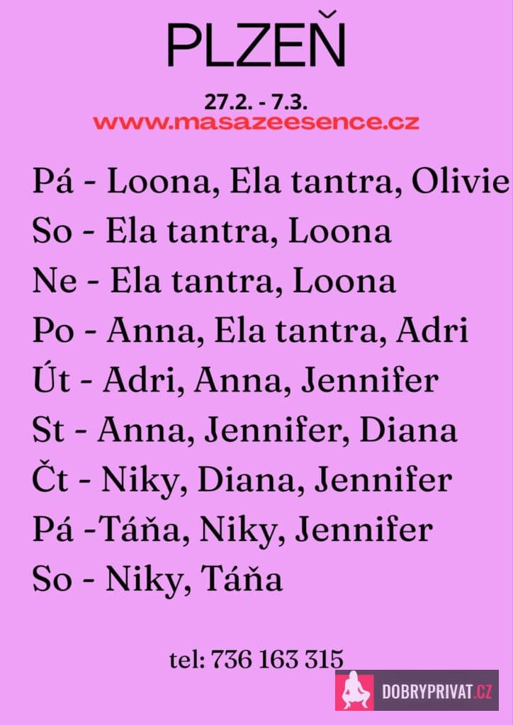 Vítám vás v salonu MASÁŽE ESENCE, www.masazeesence.cz. Jsem tu pro tebe od pondělí do středy 2.-4.3. EROTICKÁ masáž. Jsem SMYSLNÁ dívka co vás ráda potěší. Jedná se o masáž TĚLO NA TĚLO. Je to velice hravá a intimní masáž, do které zapojím nejen své ruce, ale i stehna, zadeček a prsa. Extra: pozice 69, koupací rituál, lávové kameny a další. Pro více informací volejte: 736163315. MASÍRUJI CELÁ NAHÁ. DOPORUČUJI: délku masáže 60 min. a z důvodu hlubšího prožitku 90 min. www.masazeesence.cz